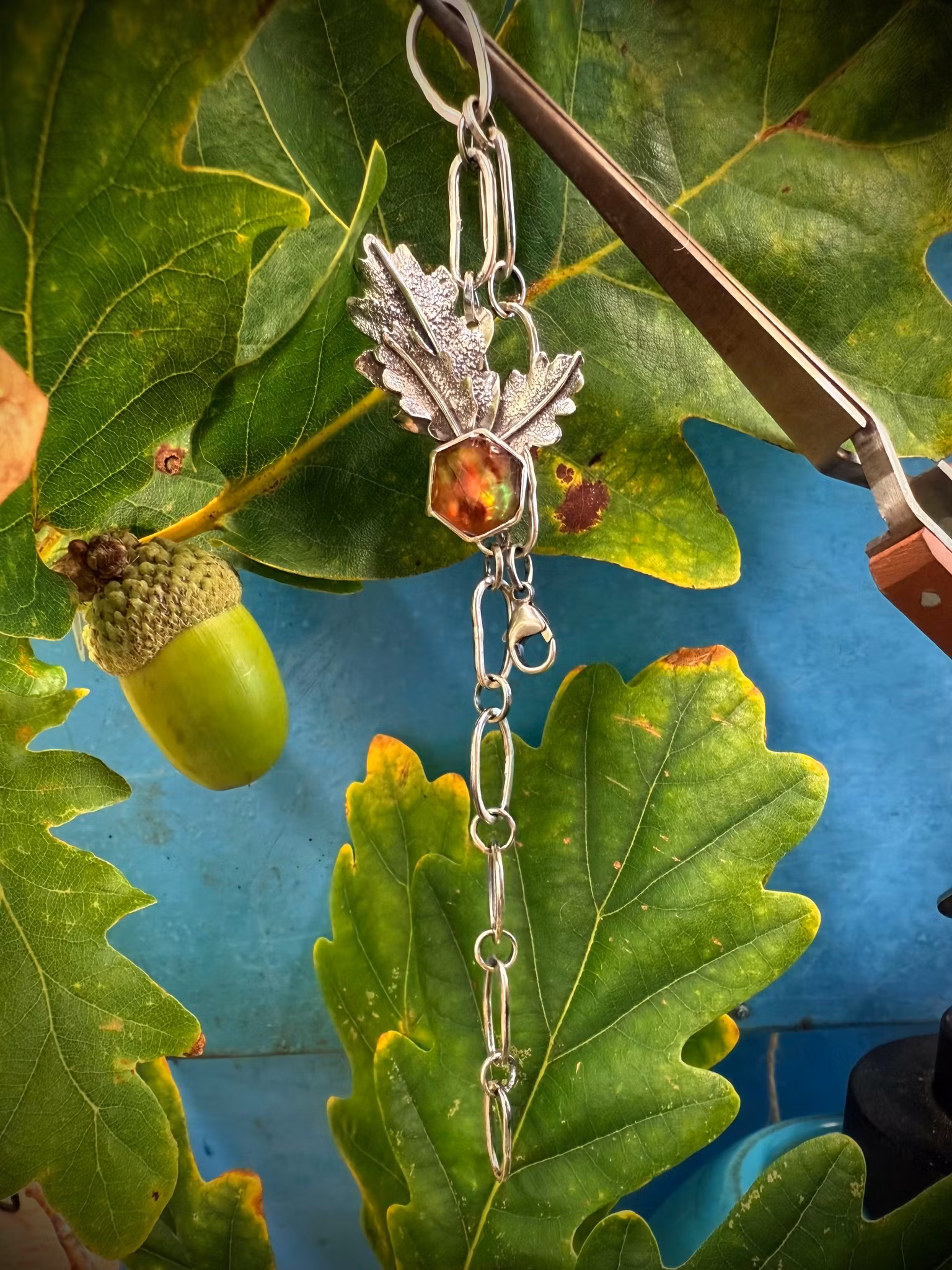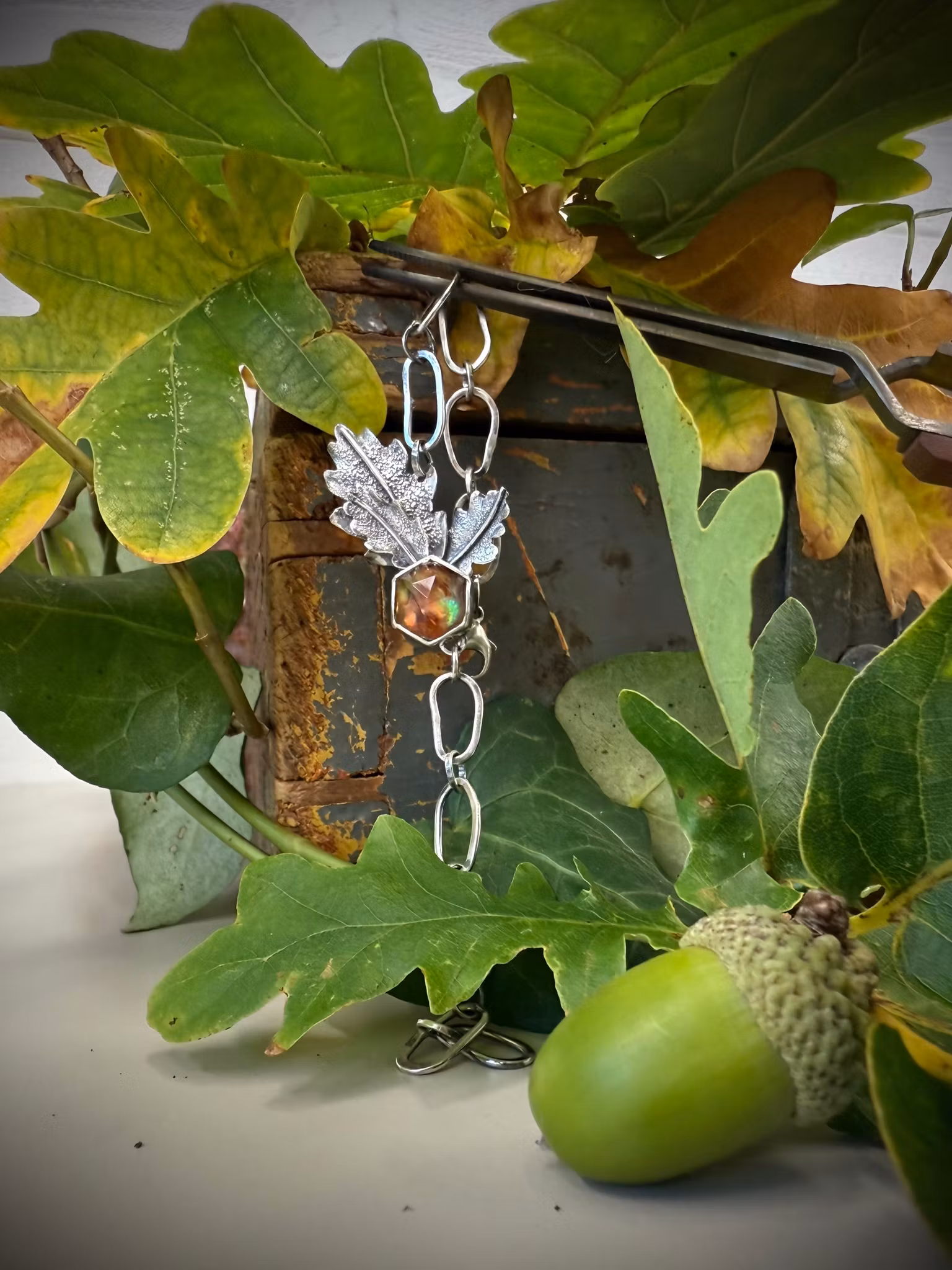 Ett armband där naturens styrka möter silvrets lyster. Oxiderade ekblad vilar som små skatter i den handgjorda länken och ramar in en gnistrande amolit som fångar varje stråle av ljus. Ett smycke som bär med sig känslan av skog och stillhet.