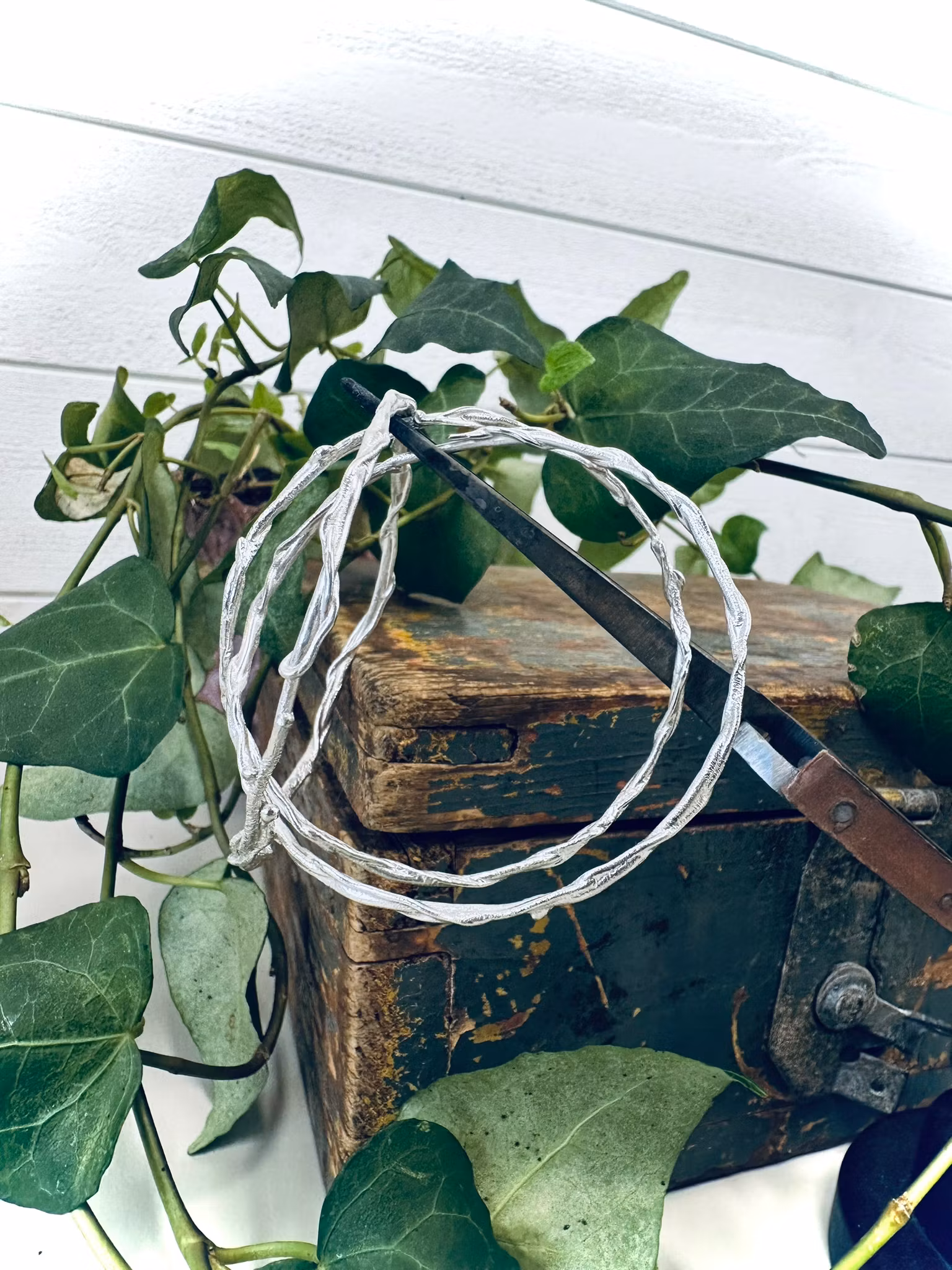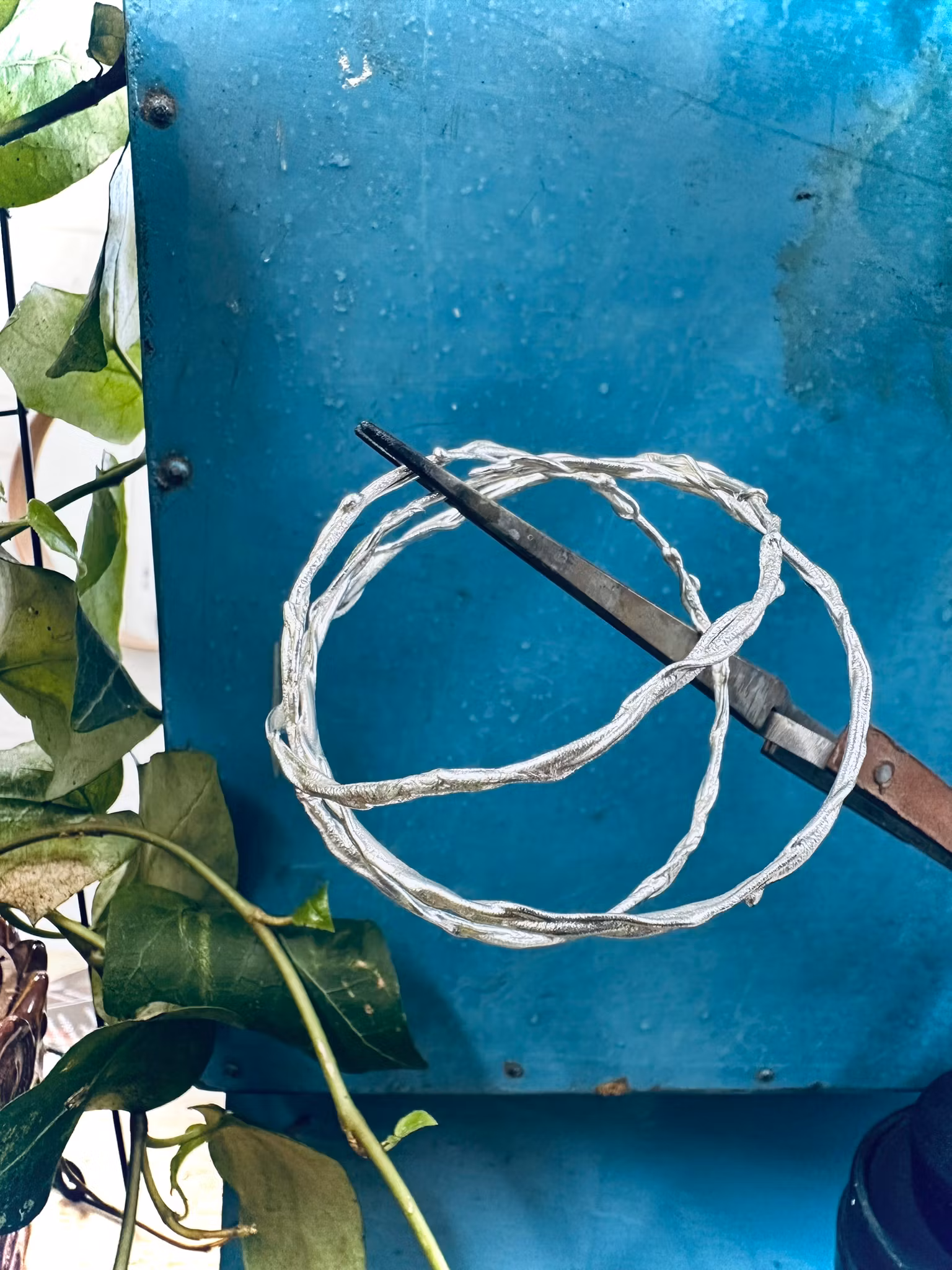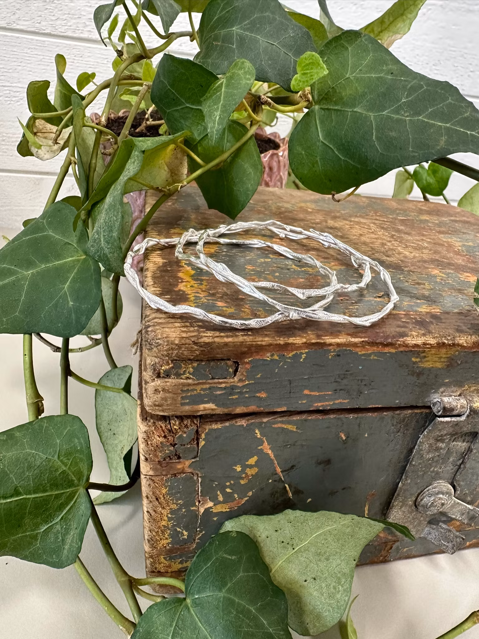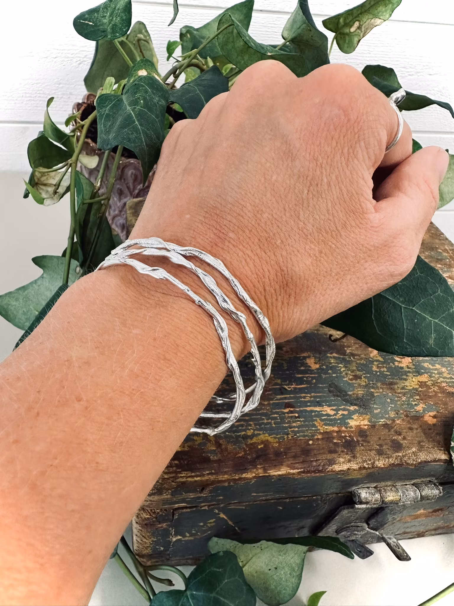 Dessa handgjorda silverarmband bär på en vacker, organisk struktur som påminner om naturens egna former – som slingrande grenar eller flätade växttrådar.