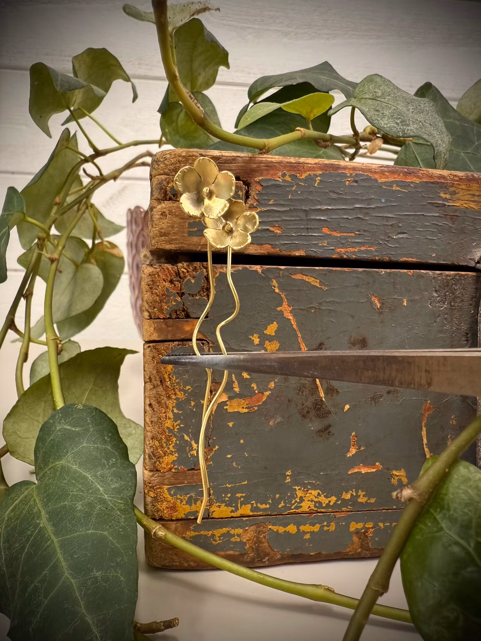 The buttercup’s stem threads through the earlobe and hangs decoratively behind the ear – each stem unique, just like in nature.