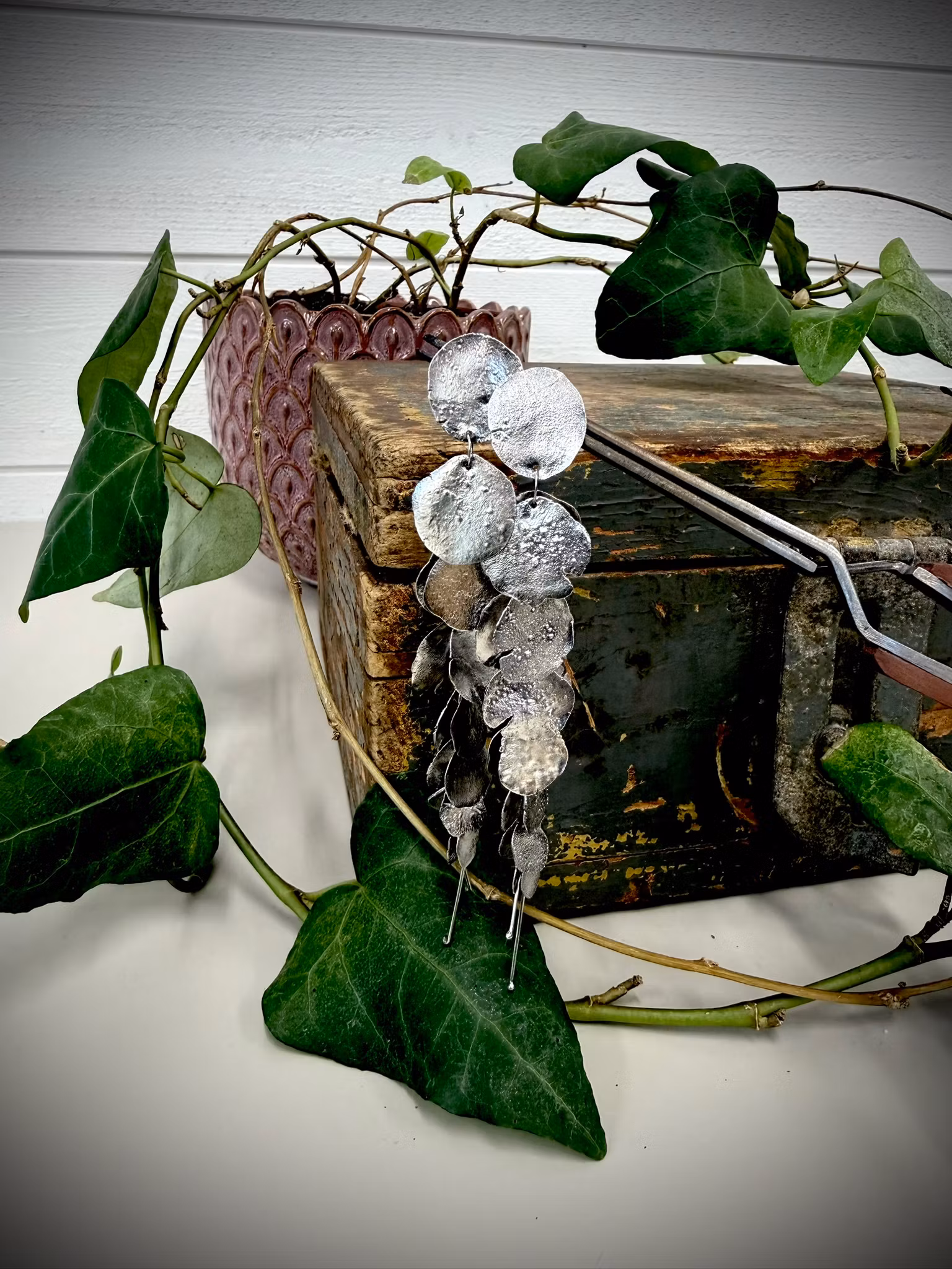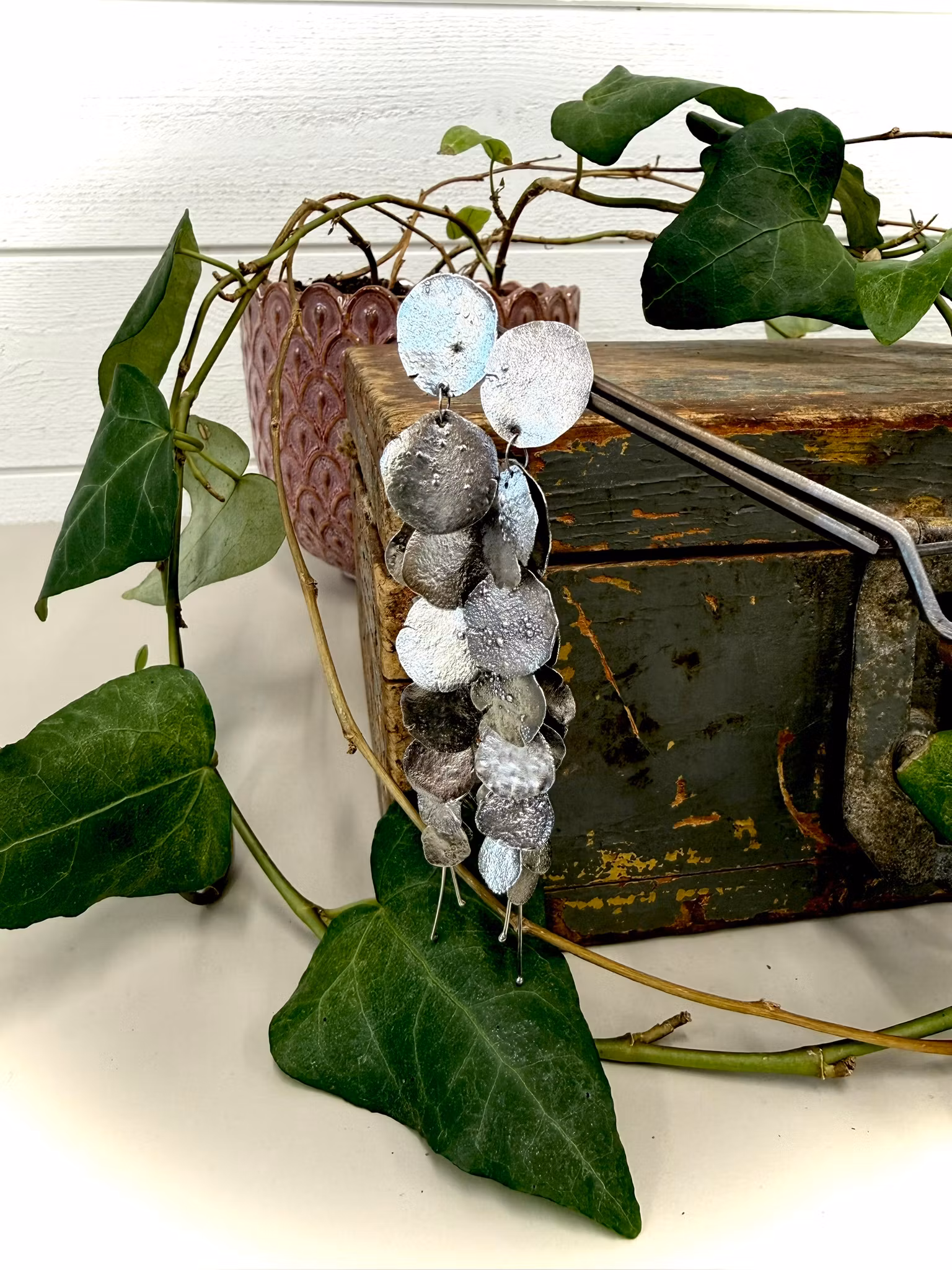 Unika handgjorda örhängen i återbrukat sterlingsilver. Varje kronblad är smält av överblivet 925 sterlingsilver och sedan hamrat tunt och polerat till ett högblankt unikt blad.