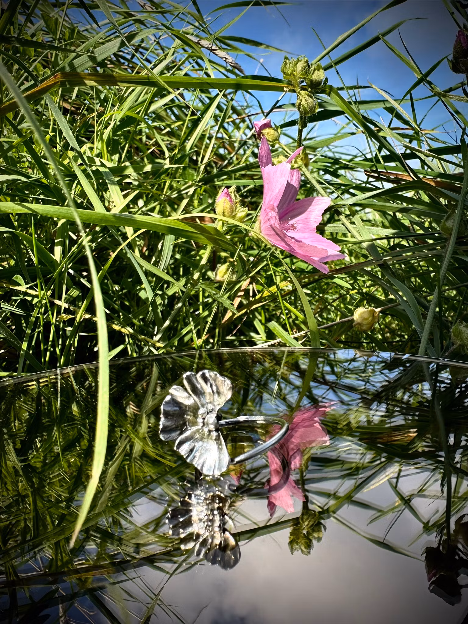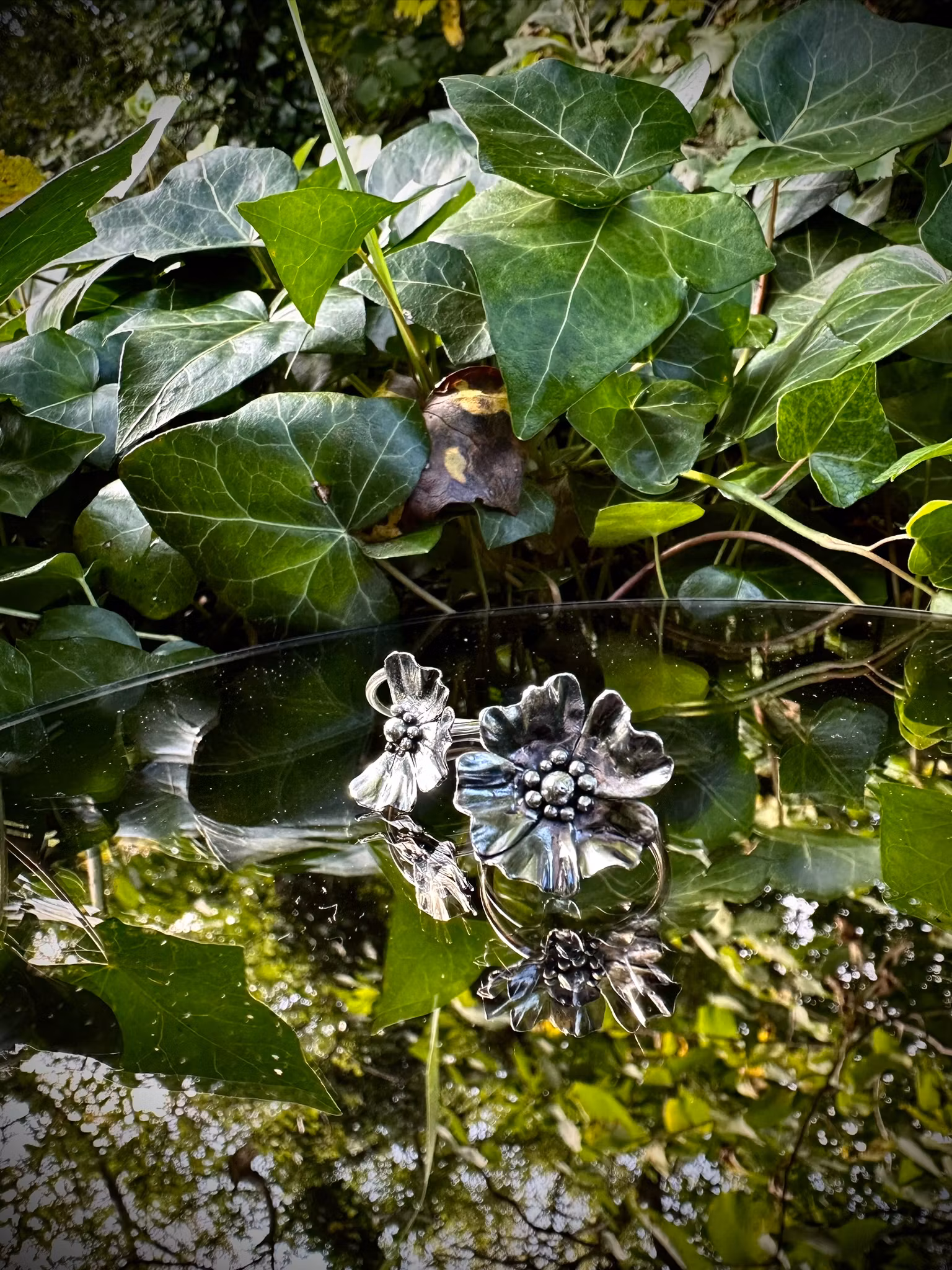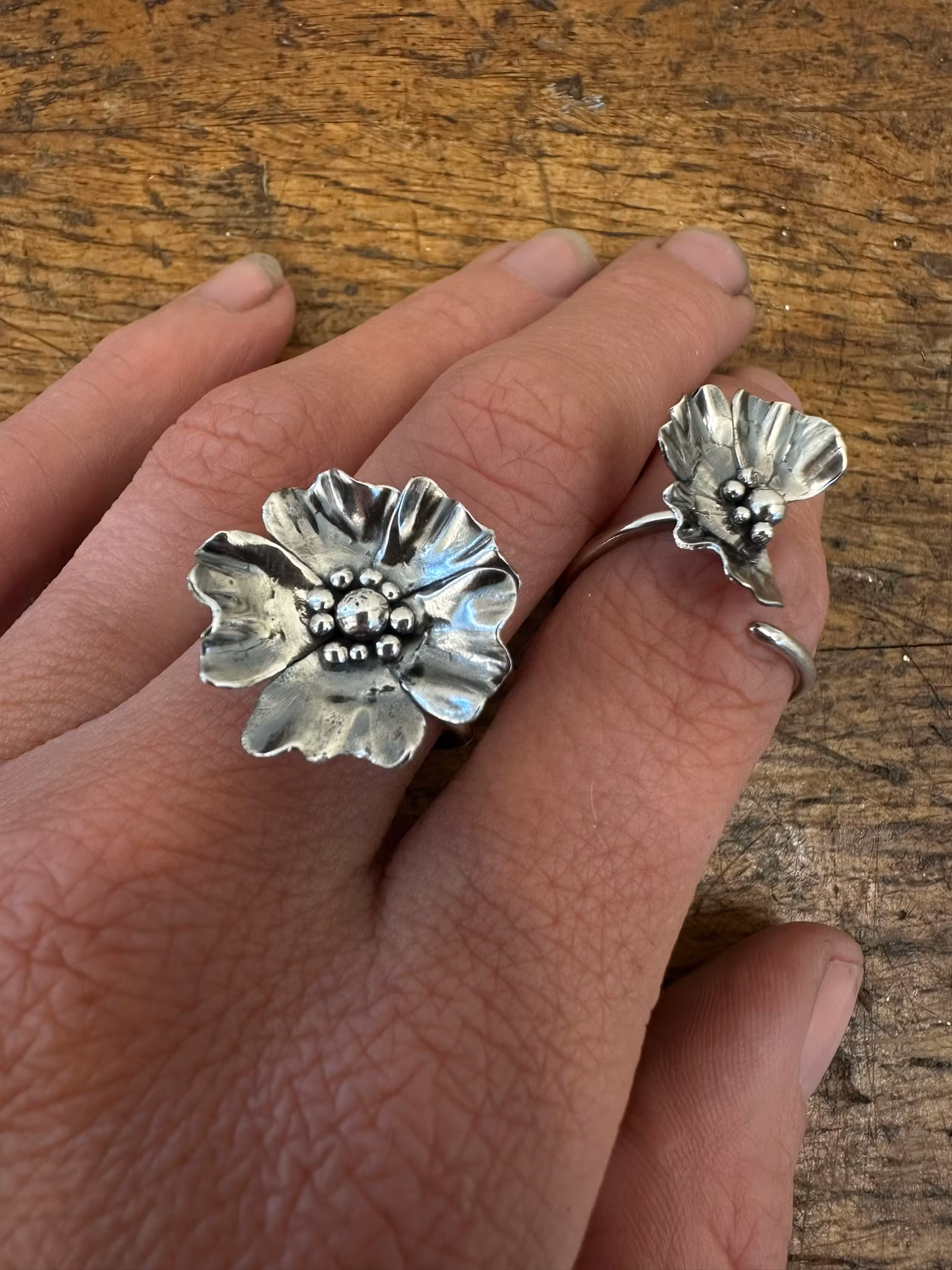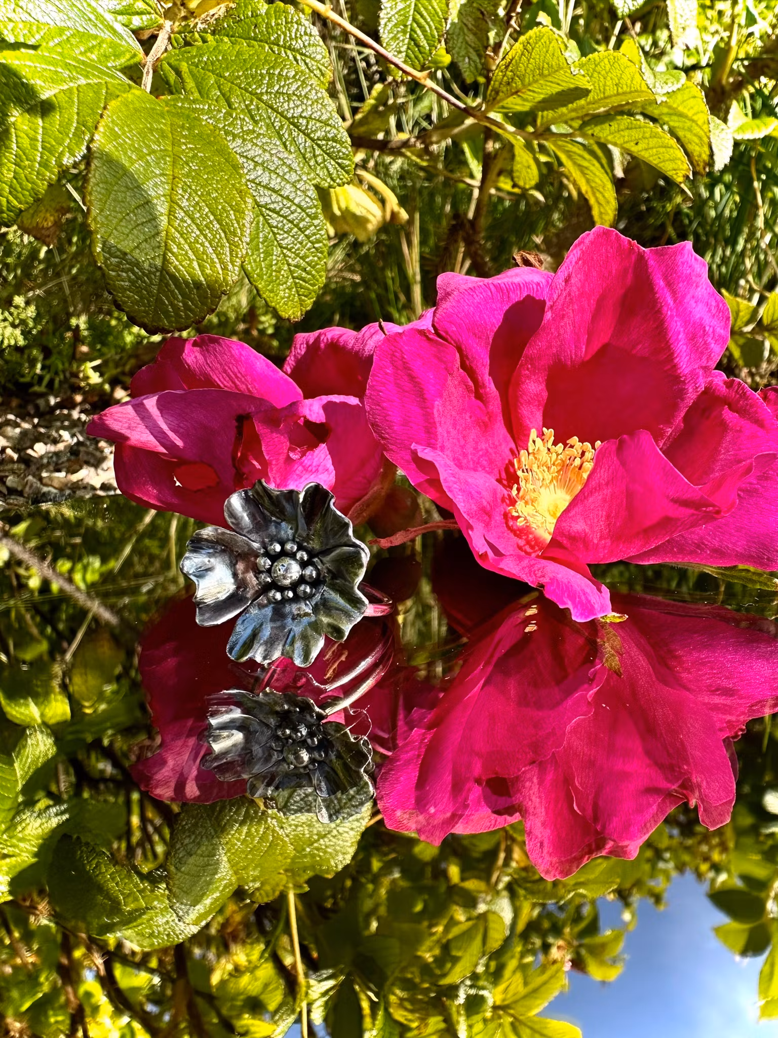 Två handgjorda silverringar inspirerade av den vilda djuprosa nyponrosens skönhet. Ena ringen har stått emot vädrets makter medans den andra tappat några kronblad i vinden.