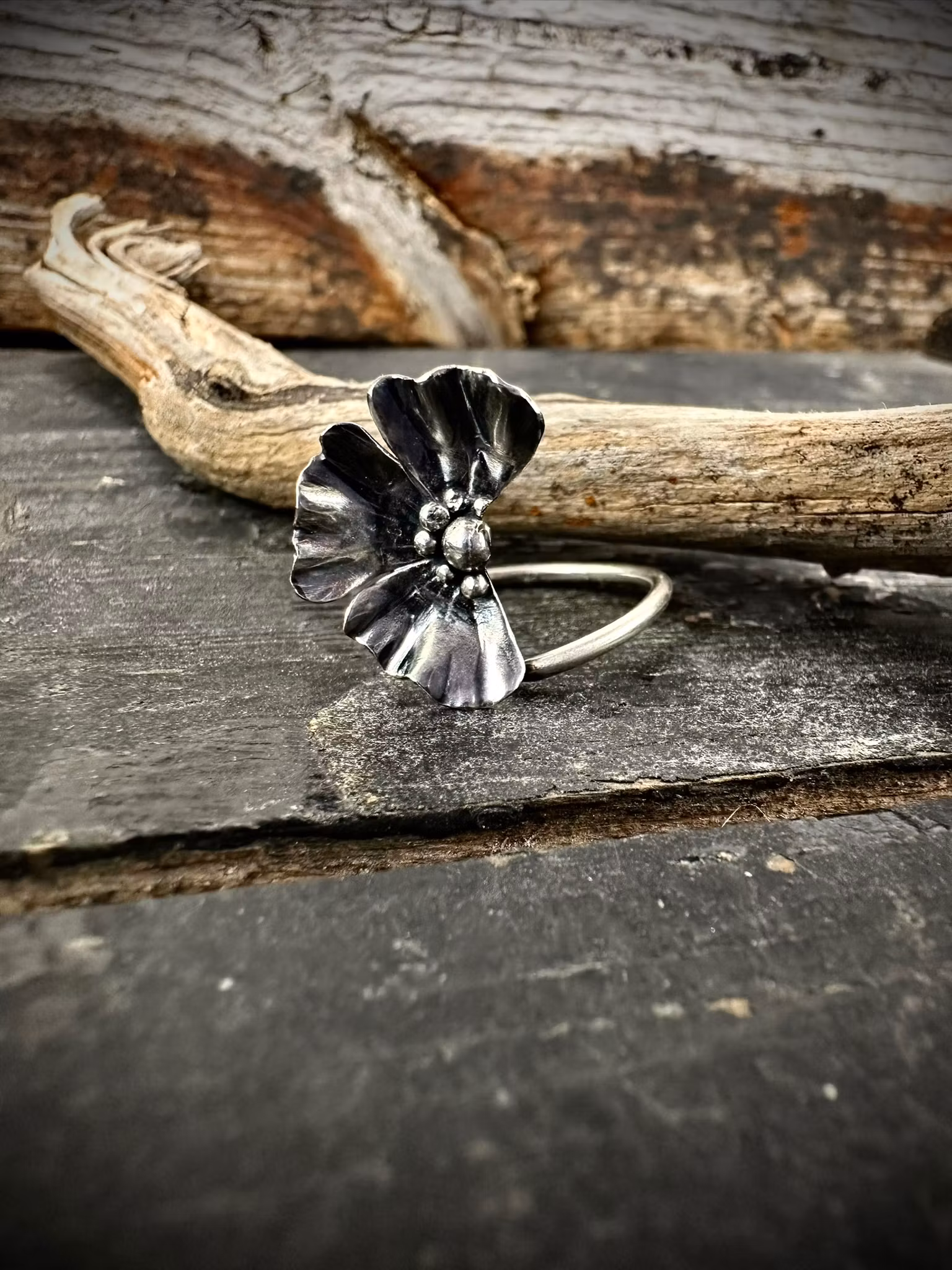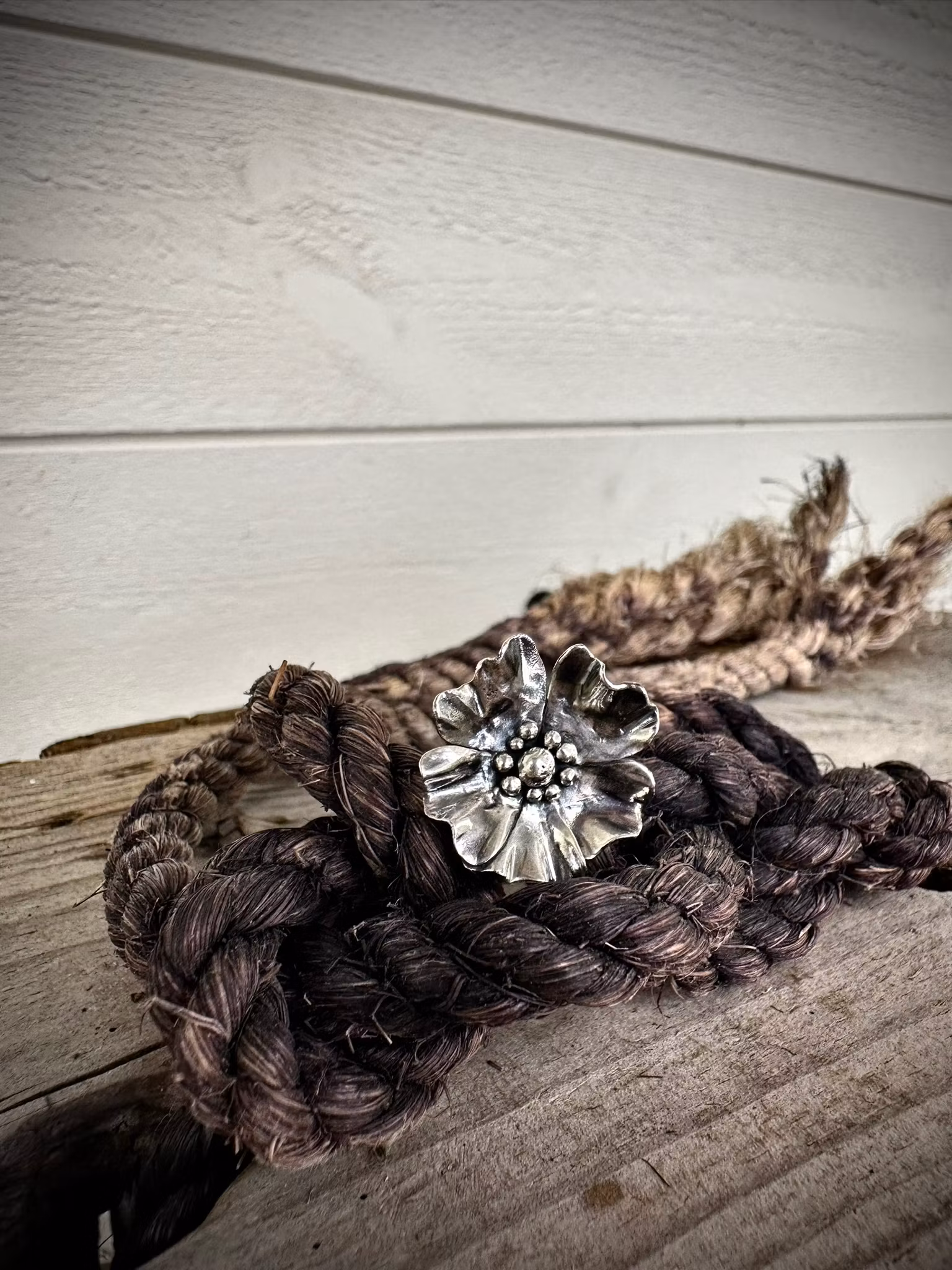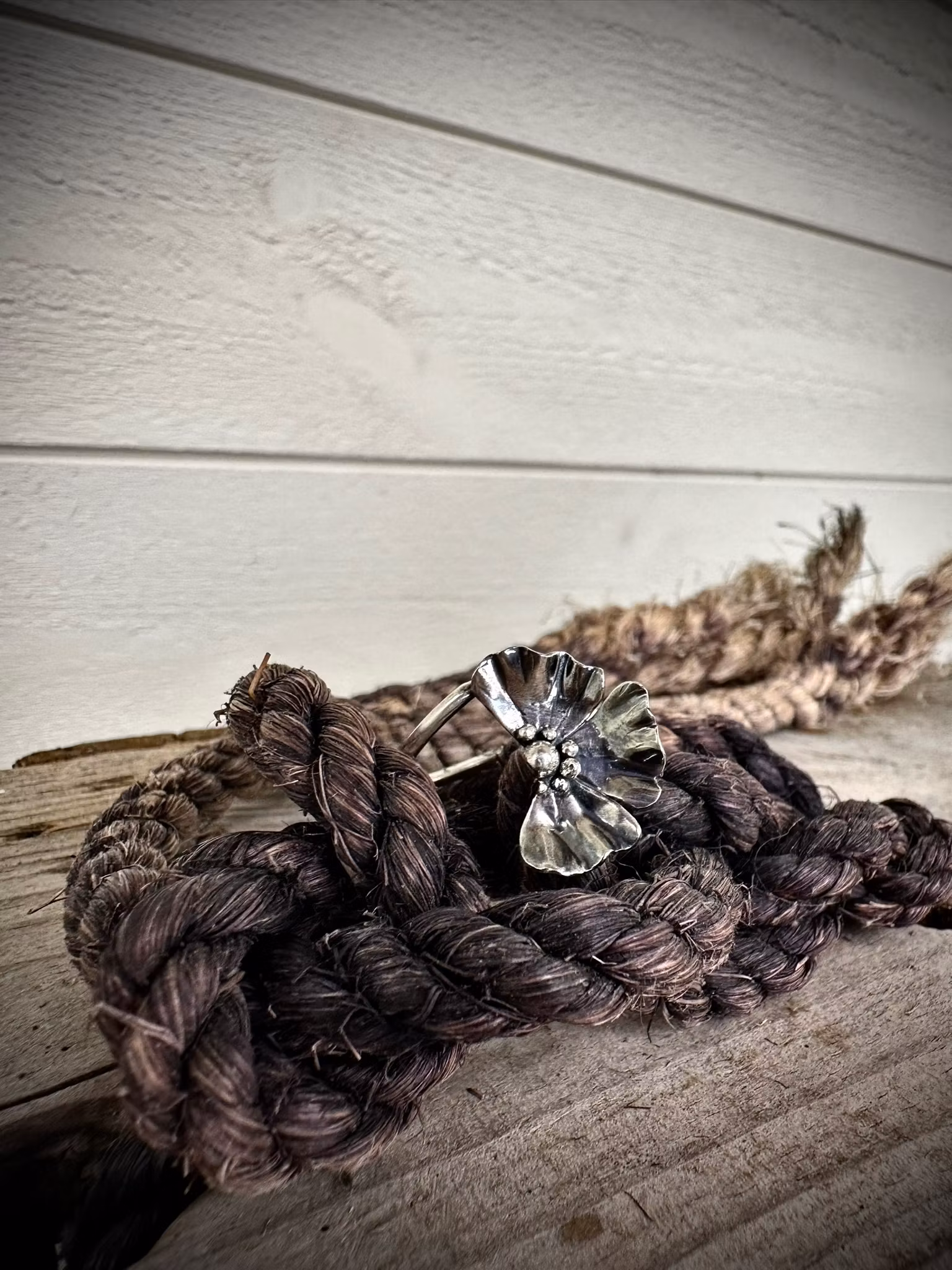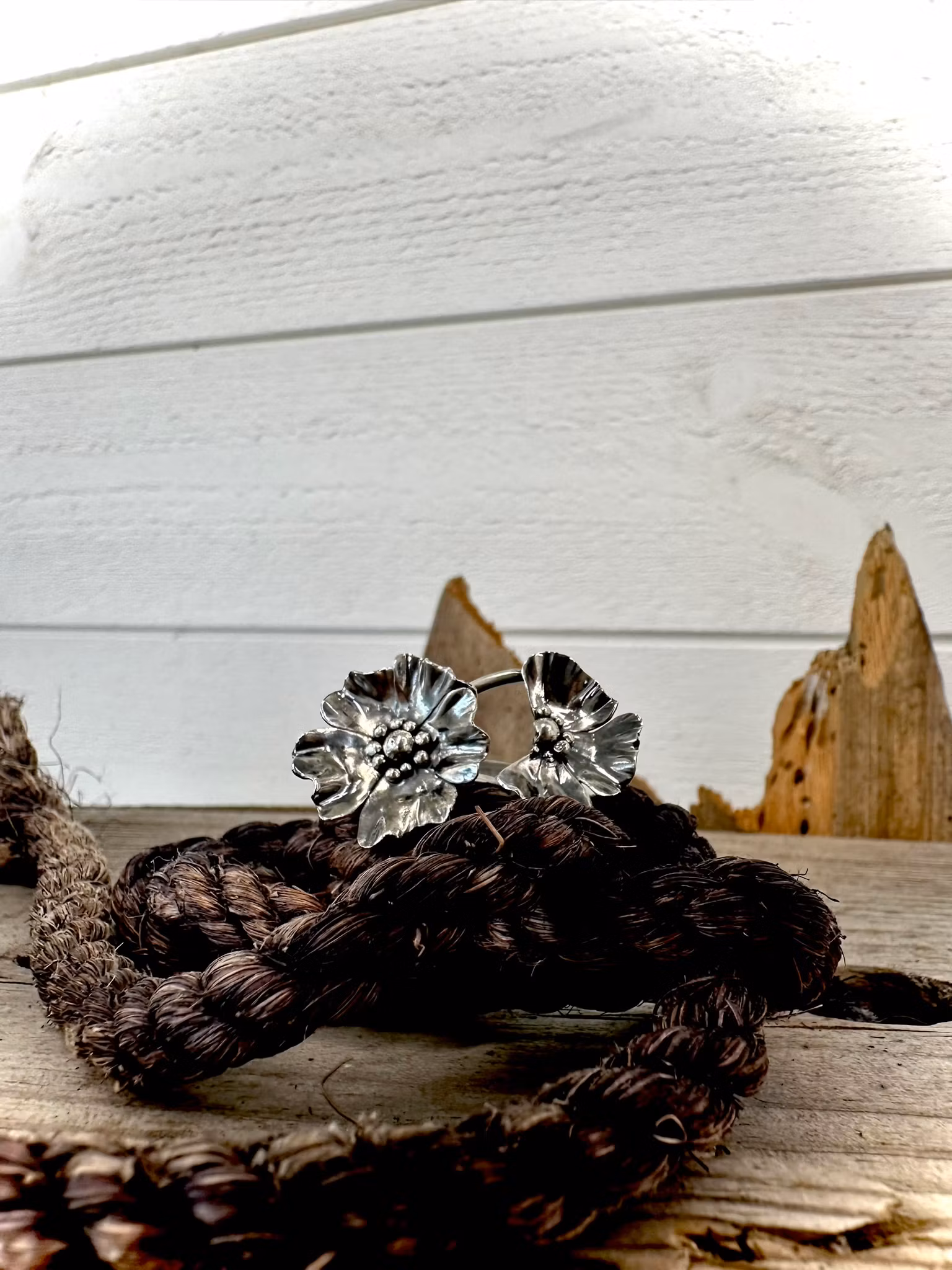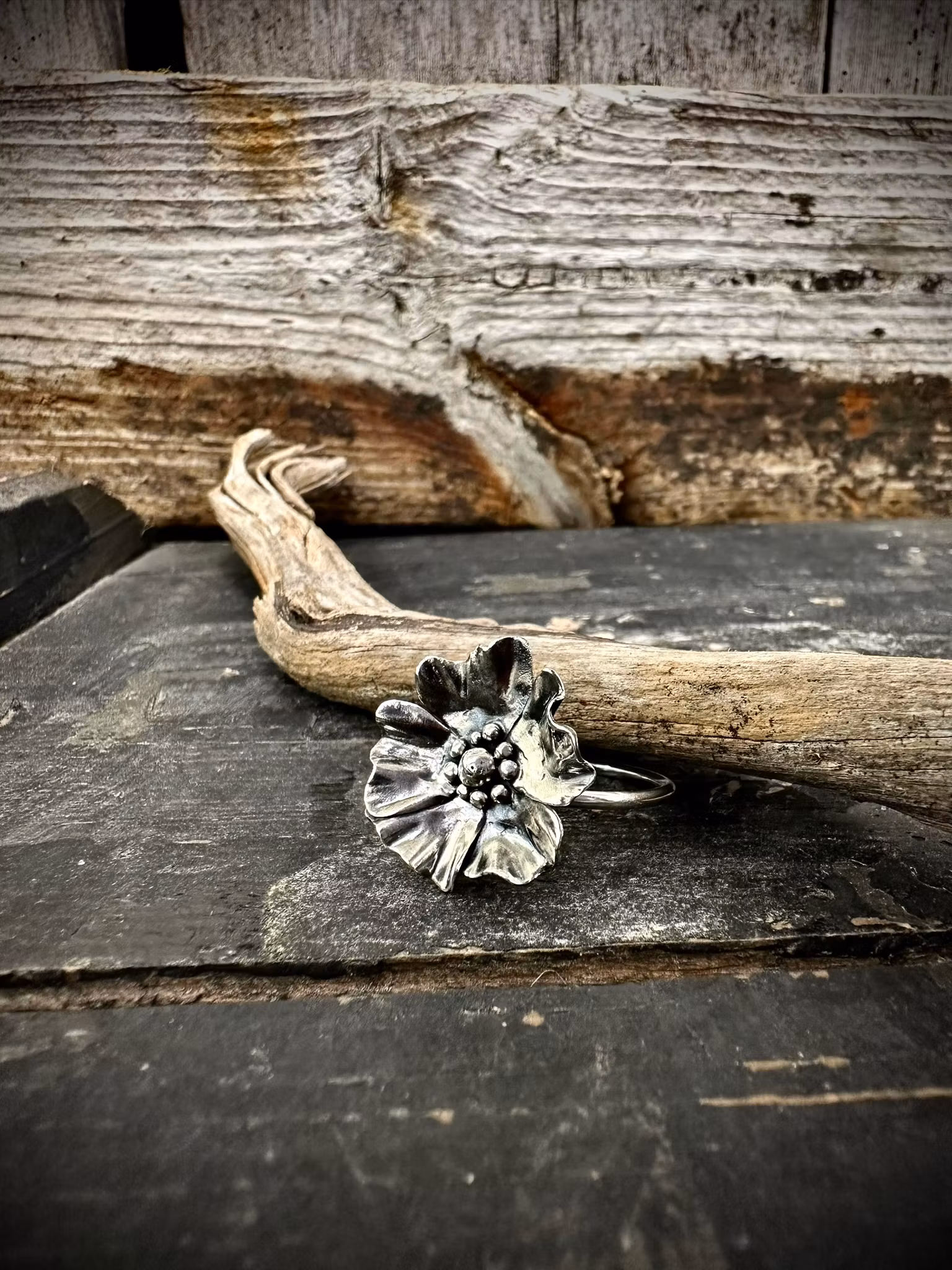 Två handgjorda silverringar inspirerade av den vilda djuprosa nyponrosens skönhet. Ena ringen har stått emot vädrets makter medans den andra tappat några kronblad i vinden.