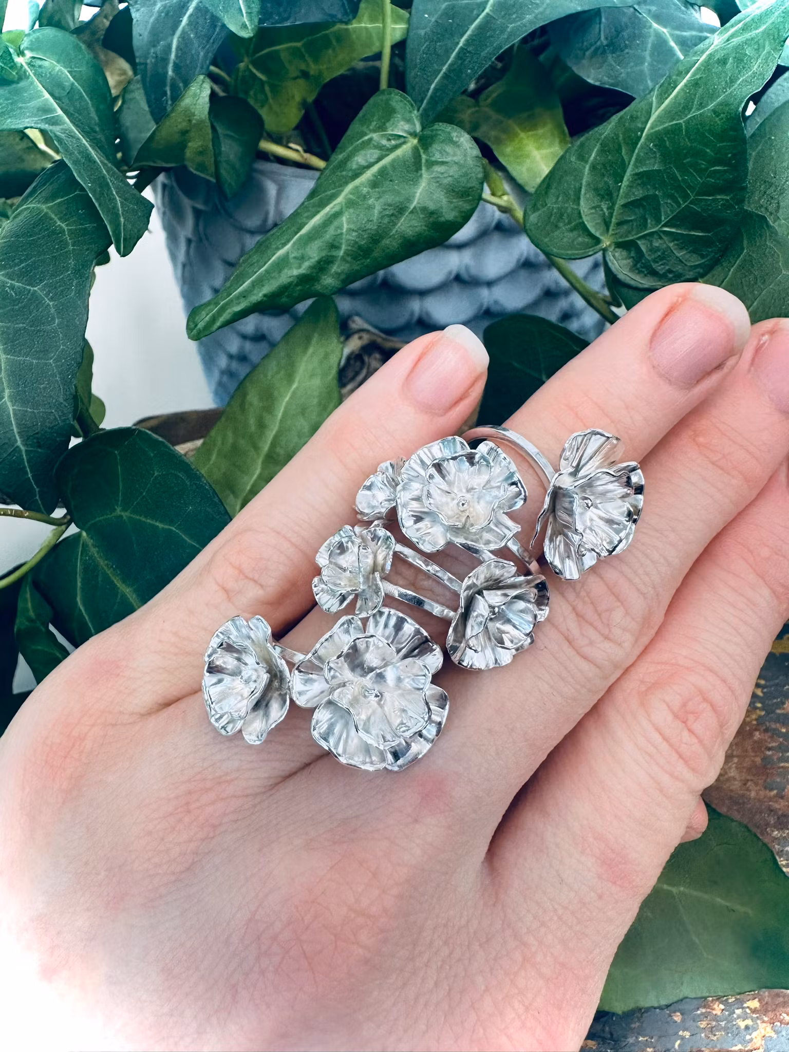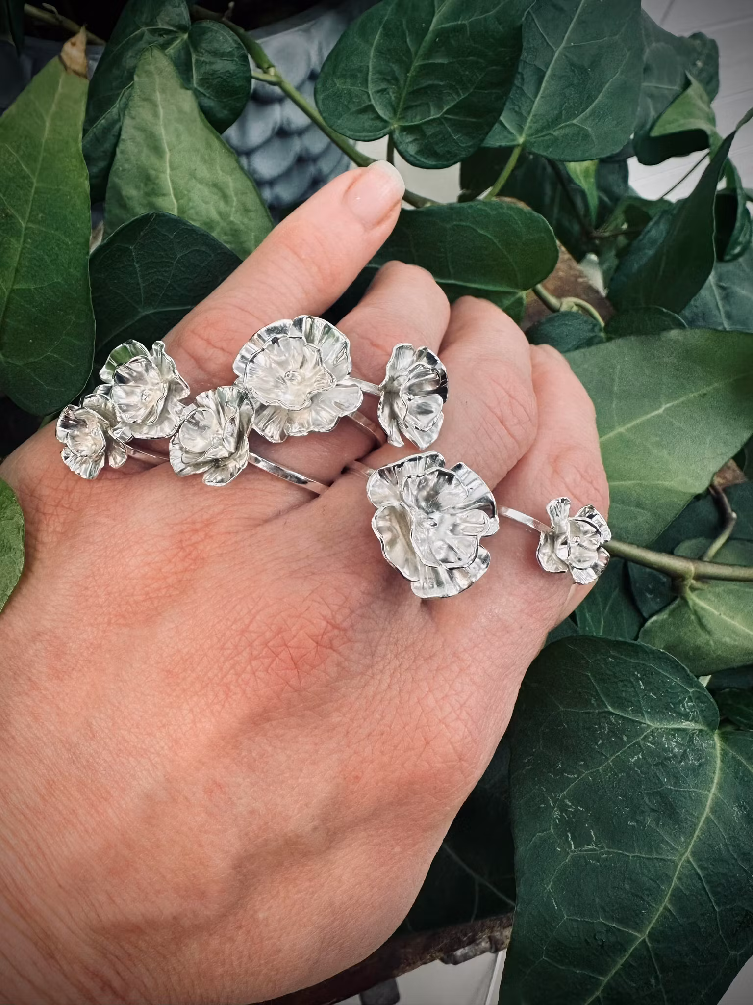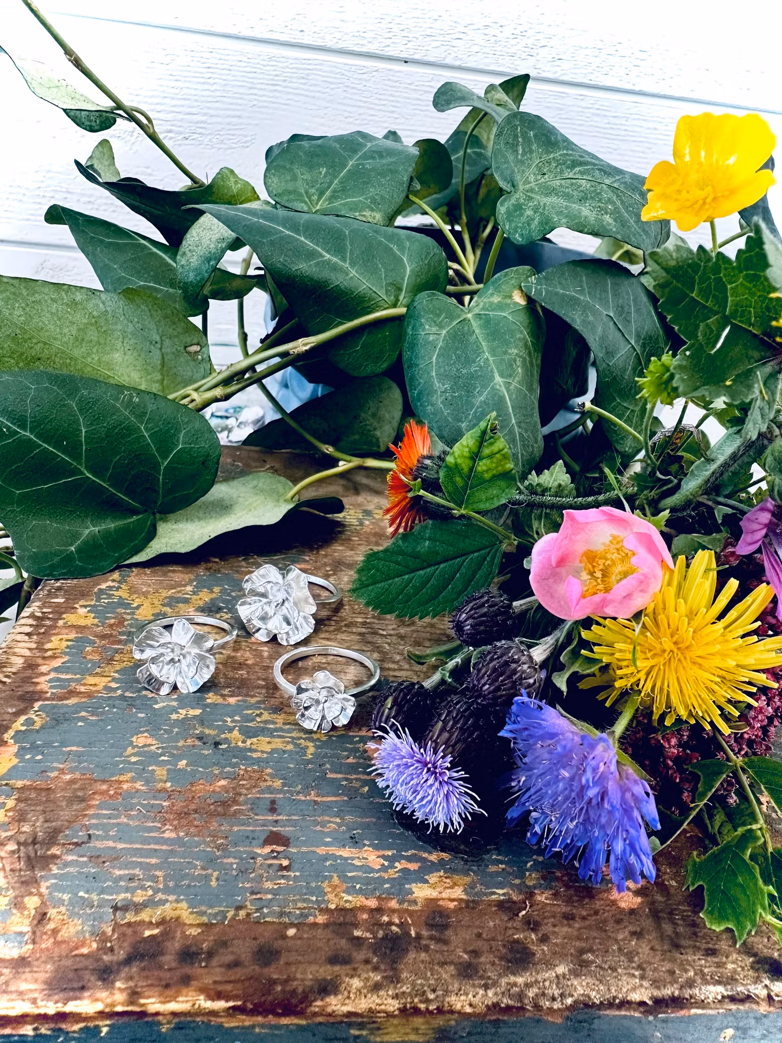 Varje ring pryds av en blomma i silver inspirerade av vilda ängsblommor. Perfekta för dig som vill bära något unikt, tidlöst och med en poetisk touch.