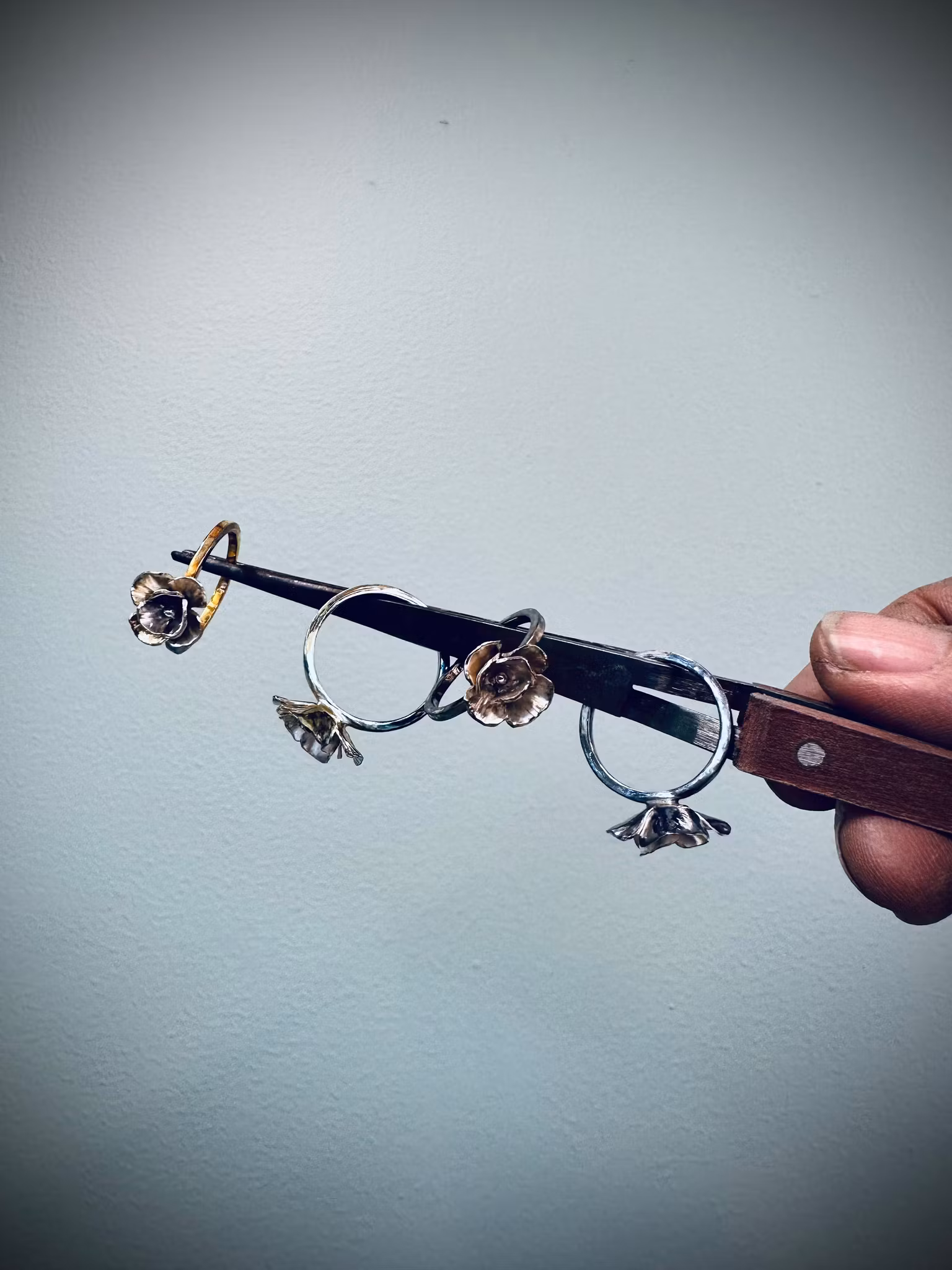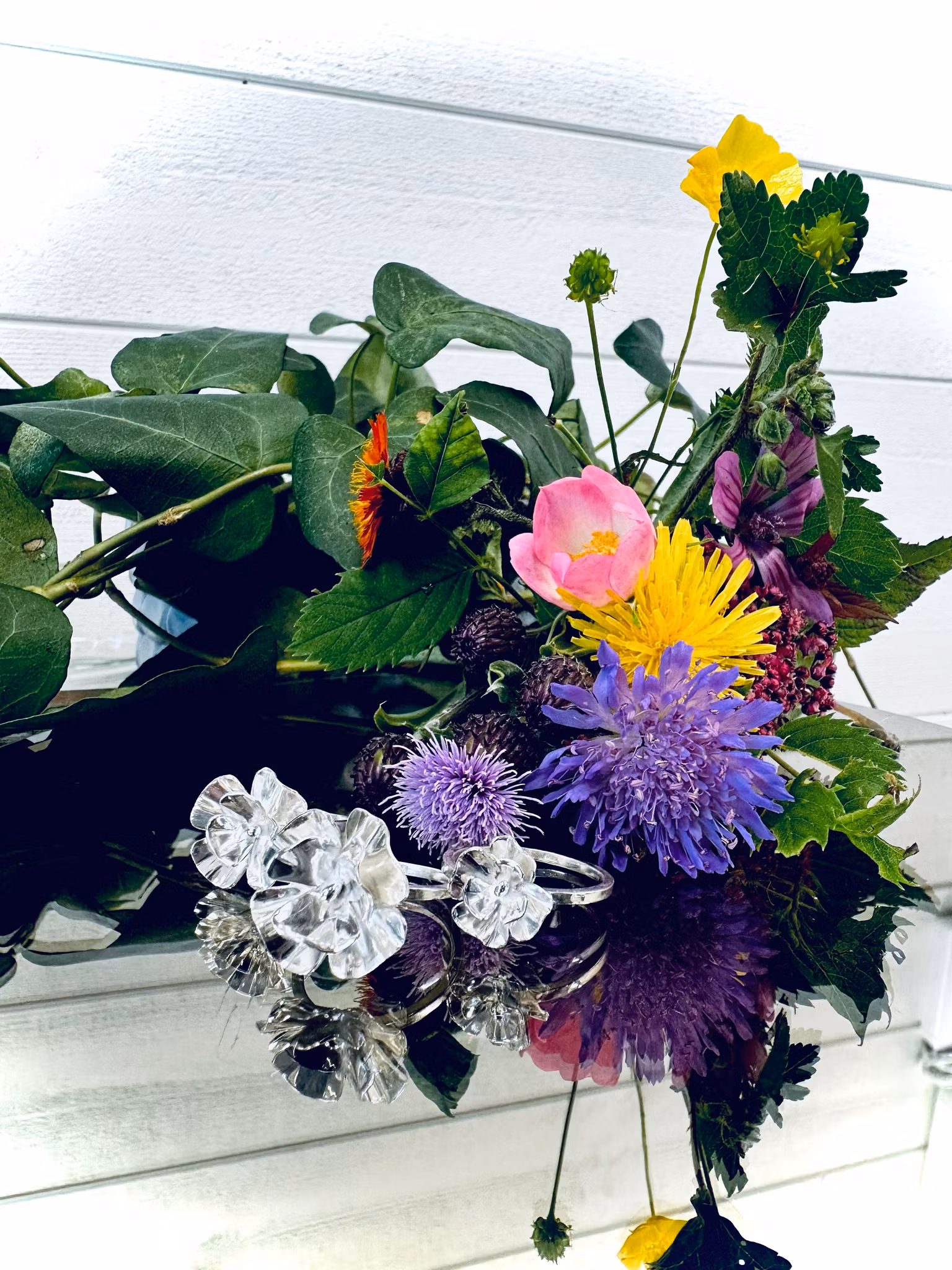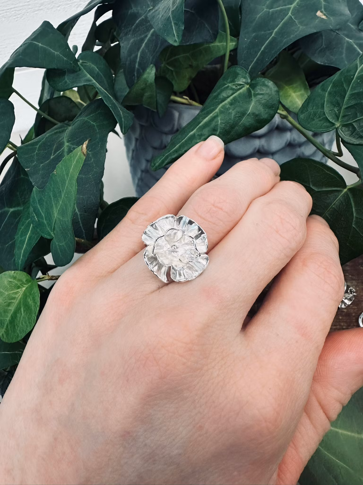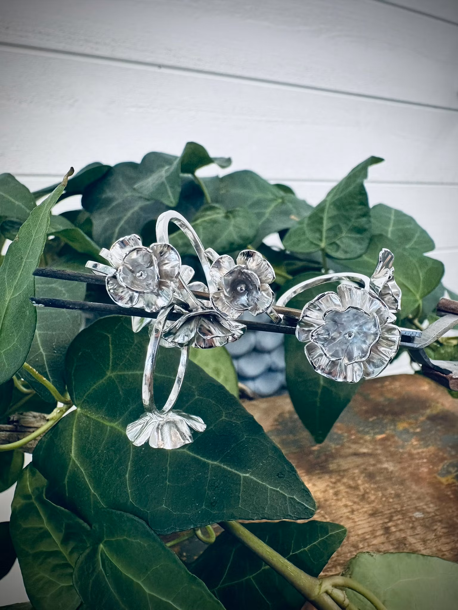 Varje ring pryds av en blomma i silver inspirerade av vilda ängsblommor. Perfekta för dig som vill bära något unikt, tidlöst och med en poetisk touch.