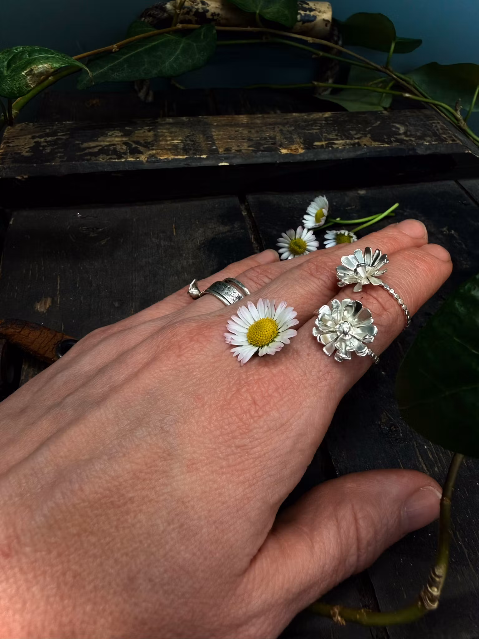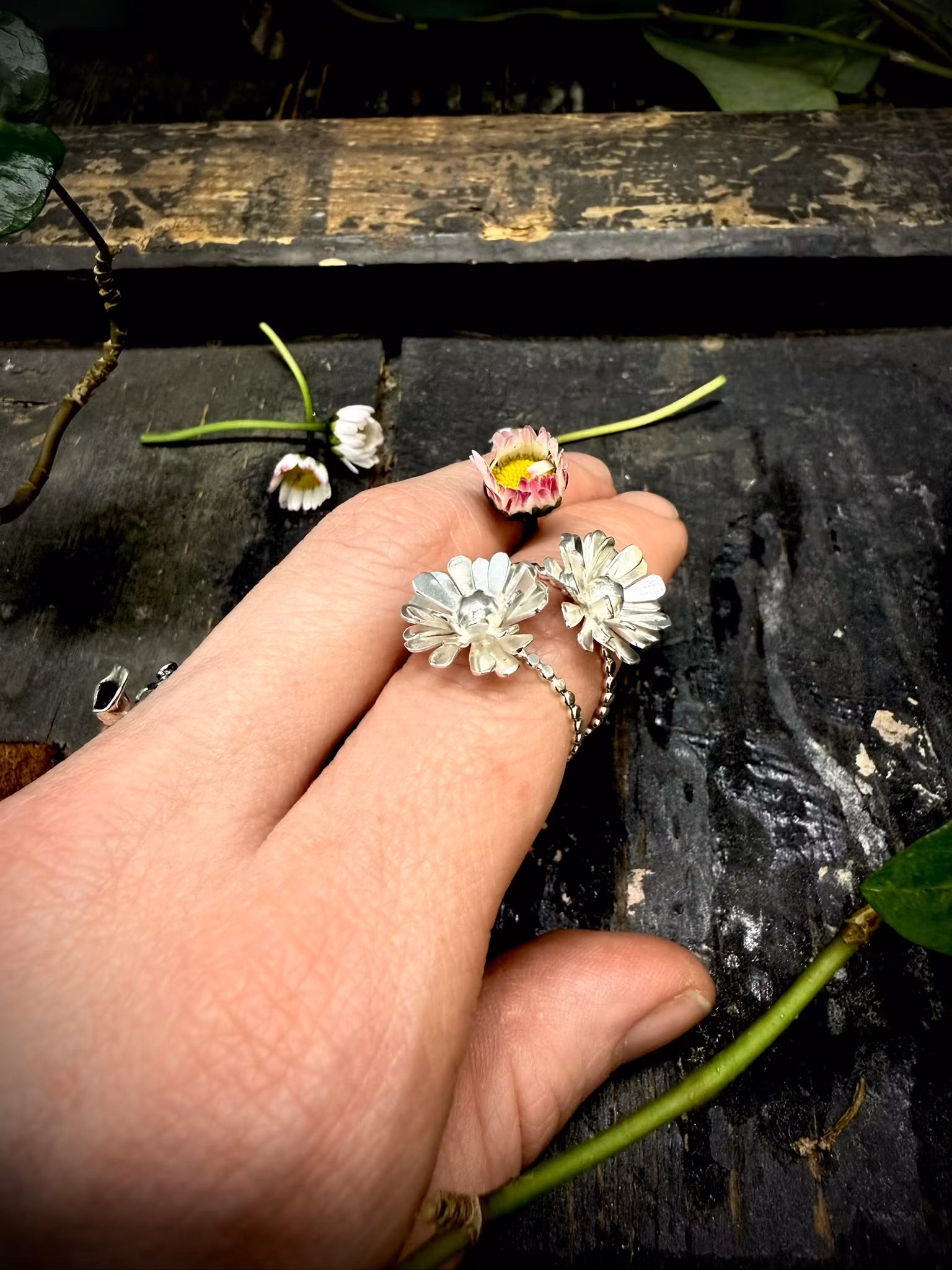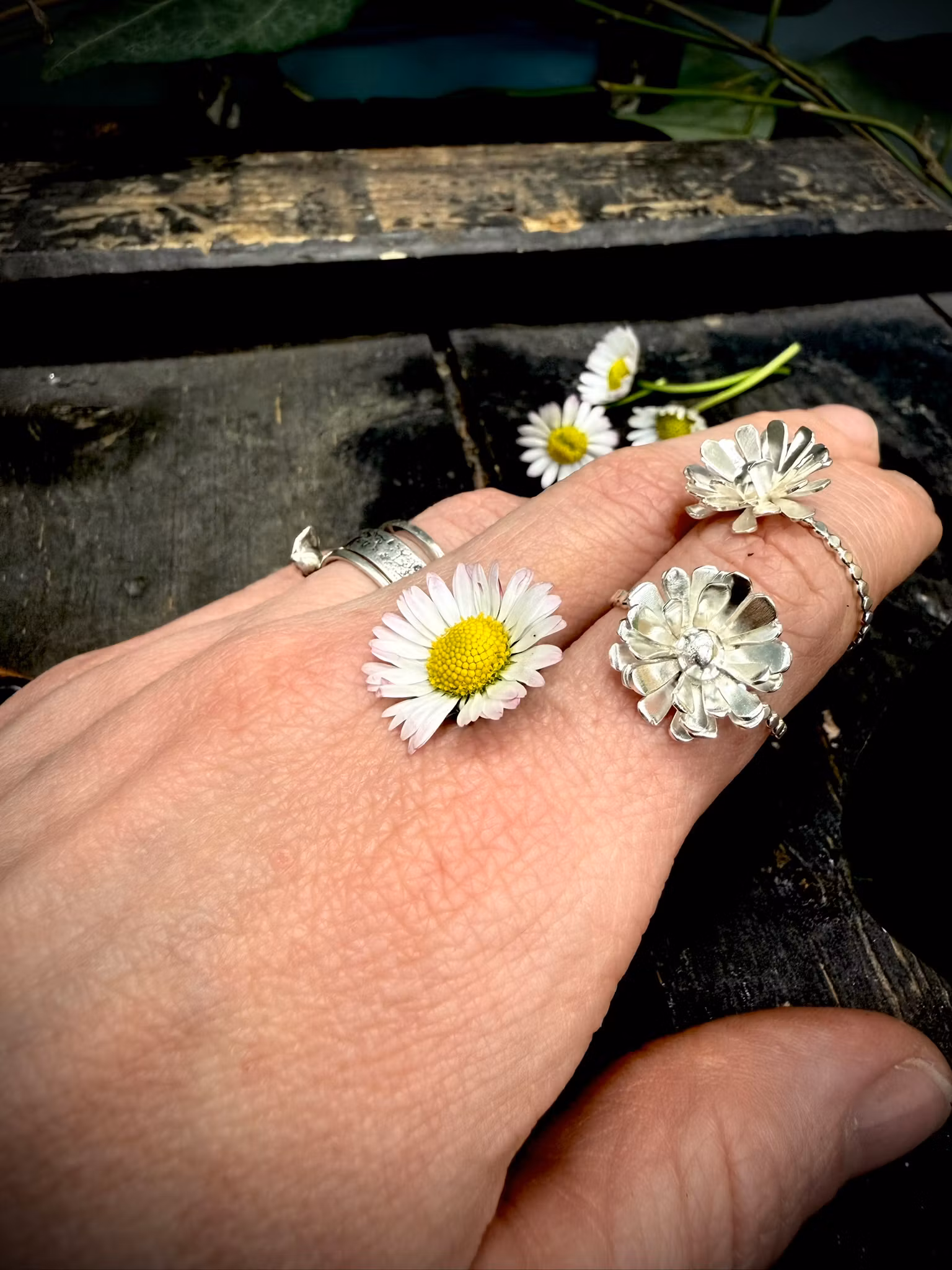 En handgjord ring i 925 sterlingsilver, inspirerad av tusenskönans enkla skönhet.