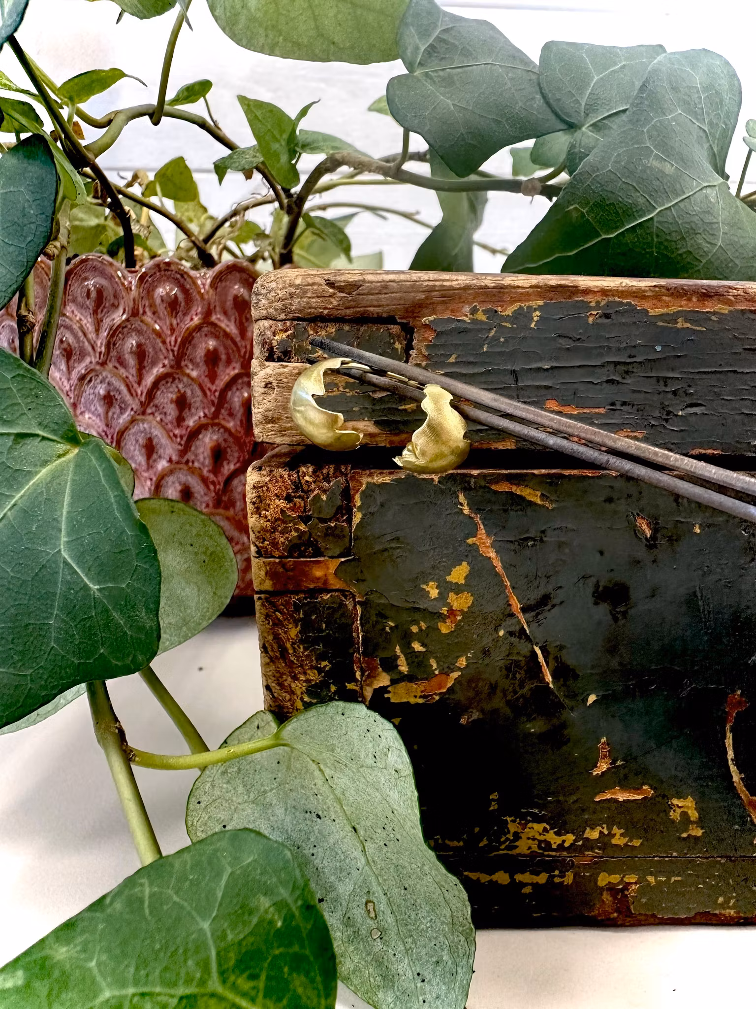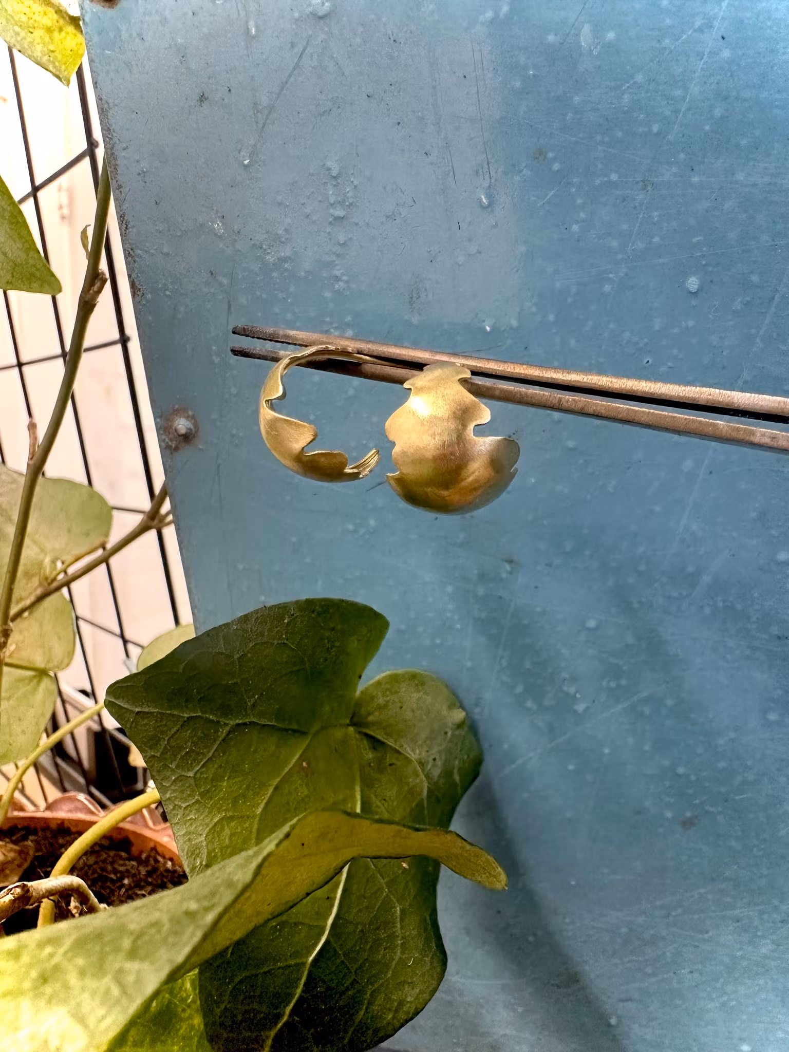 Små handgjorda mässingsörhängen med eklöv i mjukt skulpterad form.
